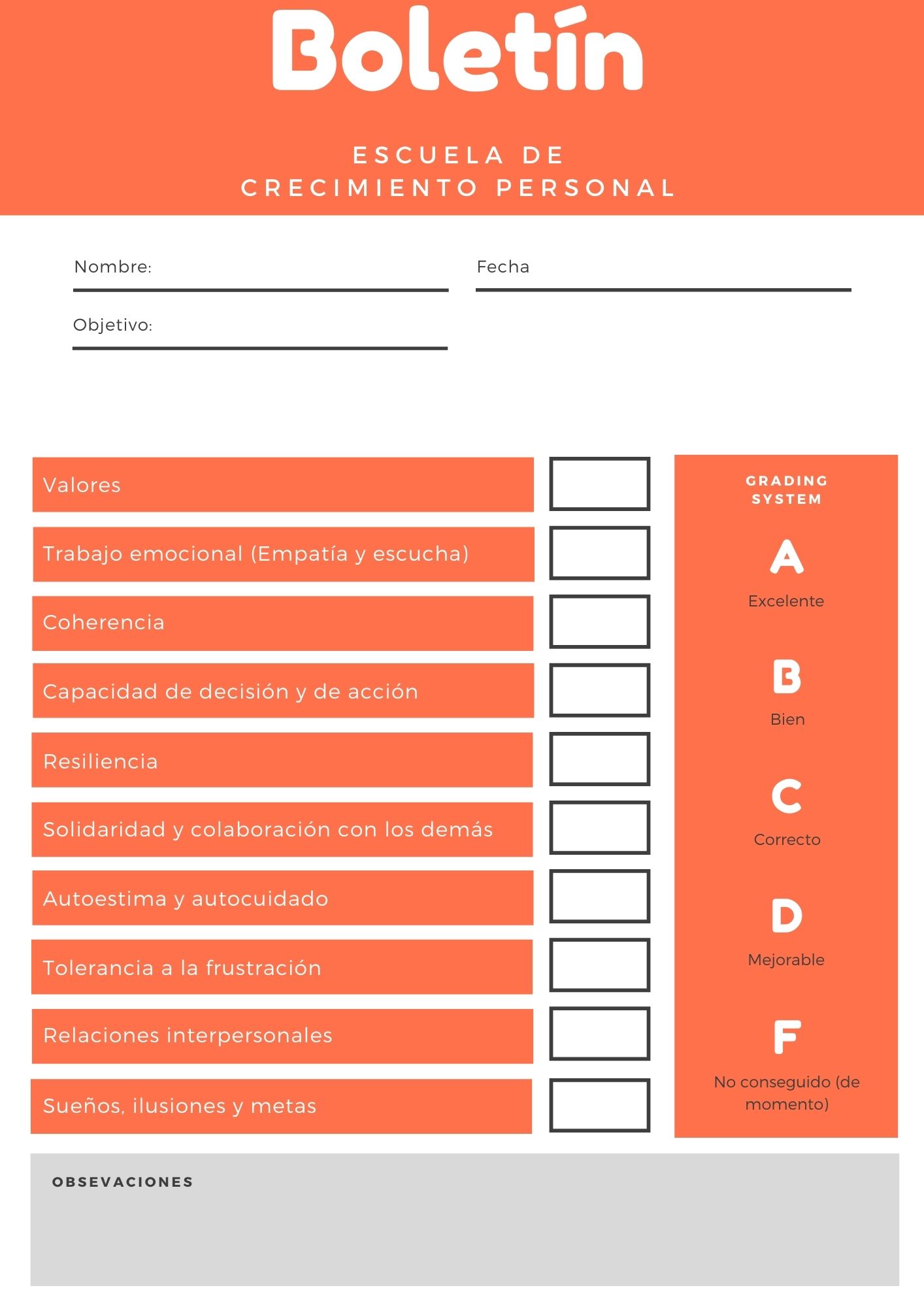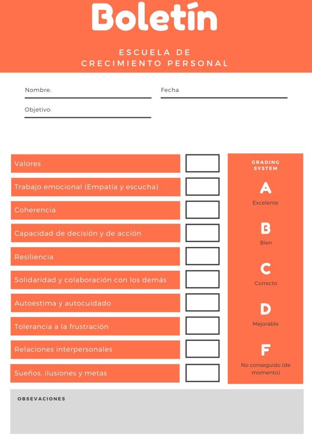 1- Valores: evalúa si has conseguido establecer nuevos valores, si son fiables y fidedignos y tu capacidad para sostenerlos y defenderlos a pesar de tus miedos, limitaciones o dudas.